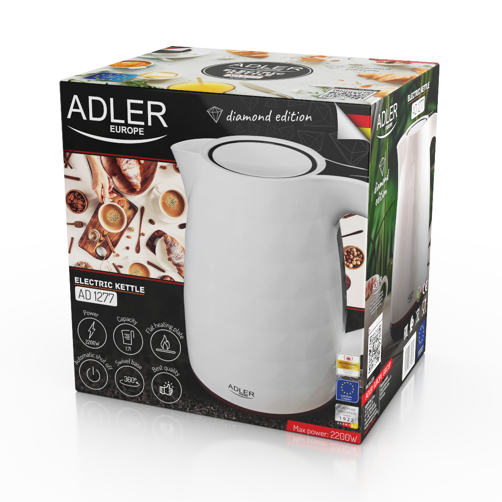 Czajnik Adler AD 1277 o mocy maks. 2200W wyznacza nowe trendy w designie sprzętu domowego. To ekskluzywna seria czajników, wybierana przez ludzi, którzy cenią atrakcyjny wygląd. Czajnik AD 1277 to znacznie więcej niż tylko przedmiot użytkowy – stanowi również niebagatelną ozdobę kuchni. Doskonały zarówno do nowocześnie urządzonego domu, jak i do przestrzeni reprezentacyjnej, jak biuro, kancelaria czy pokój konferencyjny. Pojemność 1,7l daje możliwość jednoczesnego przygotowania wrzątku dla kilku osób.