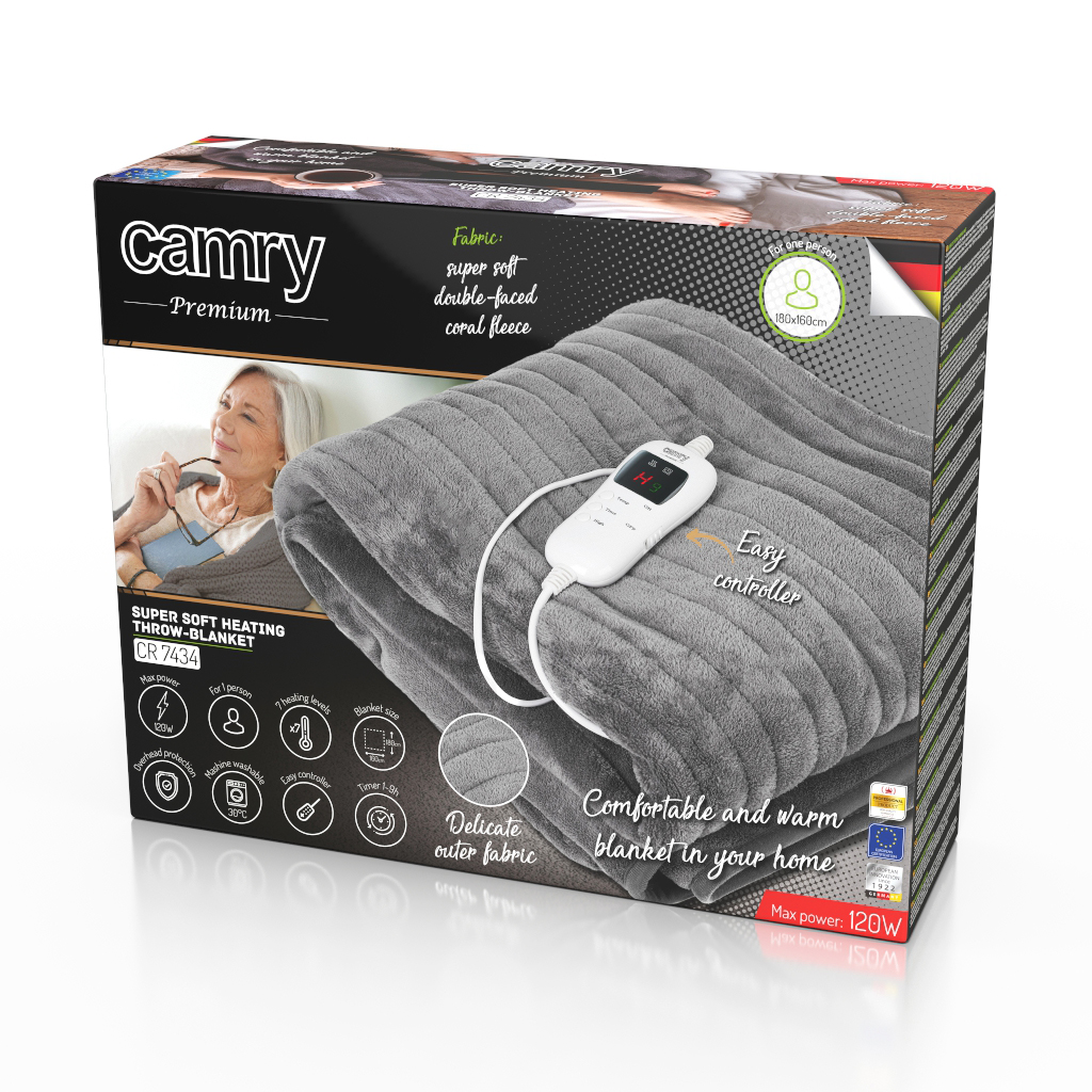 Elektryczny koc nakładany Camry 7434 zapewnia ciepło i komfort wypoczynku, umożliwia otulenie ciała z powodu wyjątkowej miękkości tkaniny oraz ogromnego rozmiaru 160x180cm. Jest również wskazane dla osób dbających o zdrowie. Uśmierza nerwobóle, koi zesztywnienie mięśni i usprawnia krążenie krwi. Łagodzi także dolegliwości reumatyczne. Zapewnia szybkie i równomierne rozprowadzenie ciepła co pozwala rozkoszować się ciepłem podczas siedzenia na fotelu. Koc wykonany jest z puszystego i miłego w dotyku materiału. Można go prać po odpięciu kabla zasilającego i kontrolera temperatury. Ten ostatni pozwala wybrać poziom temperatury i zabezpiecza przed przegrzaniem.