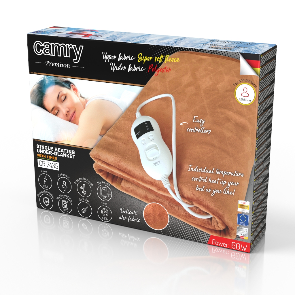 Elektryczny koc podkładowy Camry zapewnia ciepło i komfort wypoczynku. Jest również wskazane dla osób dbających o zdrowie. Zapewnia szybkie i równomierne rozprowadzenie ciepła co pozwala rozkoszować się ciepłą pościelą już w kilka minut po włączeniu. Koc wykonany jest z miękkiego, przytulnego i miłego w dotyku materiału. Można go prać po odpięciu kabla zasilającego i kontrolera temperatury. Ten ostatni pozwala wybrać poziom temperatury i zabezpiecza przed przegrzaniem. Model CR 7435 Camry, o wymiarach wysokość: 150cm & szerokość: 80cm przeznaczony jest dla 1 osoby.