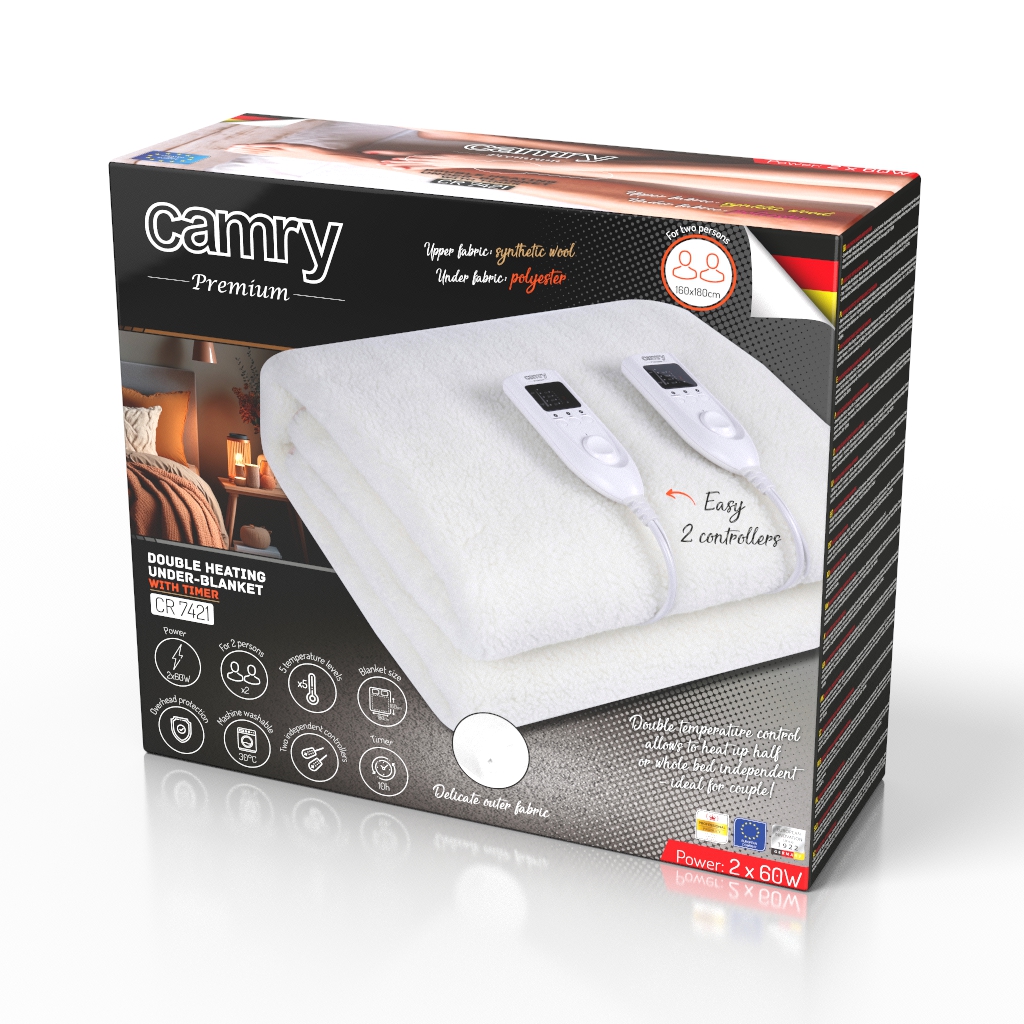 Elektryczny koc podkładowy Camry zapewnia ciepło i komfort wypoczynku. Jest również wskazane dla osób dbających o zdrowie. Zapewnia szybkie i równomierne rozprowadzenie ciepła co pozwala rozkoszować się ciepłą pościelą już w kilka minut po włączeniu. Koc wykonany jest z miękkiej i przytulnej wełny syntetycznej. Można go prać po odpięciu kabla zasilającego i kontrolera temperatury. Ten ostatni pozwala wybrać poziom temperatury i zabezpiecza przed przegrzaniem. Model CR 7421 Camry, o wymiarach wysokość: 160cm & szerokość: 180cm przeznaczony jest dla 2 osób.