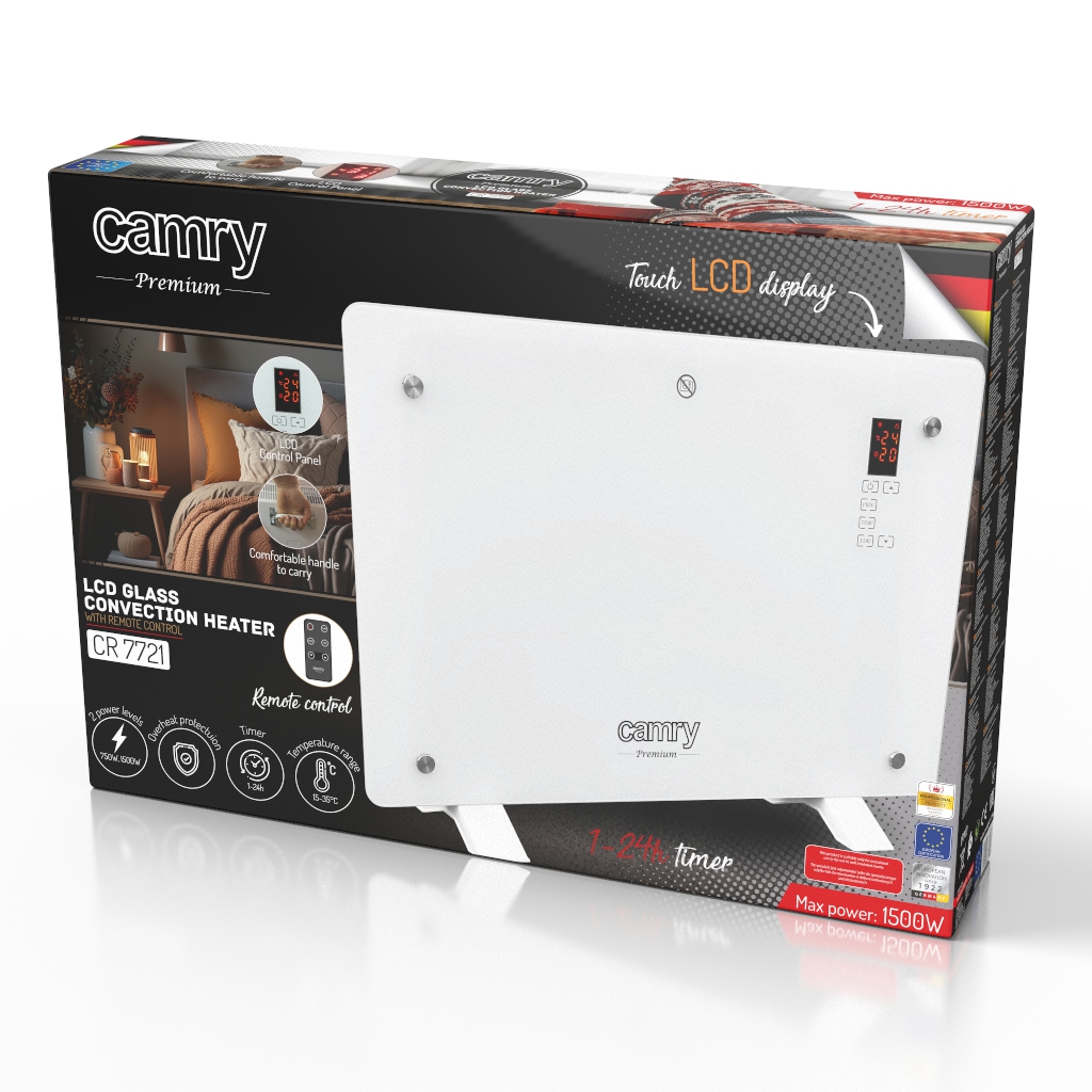 Grzejnik konwektorowy CR7721 to urządzenie dla klientów poszukujących estetycznych i nowoczesnych produktów. Posiada czytelny wyświetlacz LCD wskazujący obecną temperaturę pokojową oraz dotykowy panel sterowania. 2-stopniowa moc grzania pozwala na dopasowanie temperatury grzania do własnych potrzeb. 24 godzinny czasomierz umożliwia ustawienie czasu po jakim urządzenie automatycznie wyłączy się. Urządzenie ma szeroki zakres regulacji temperatury oczekiwanej: 15-35°C. Grzejnik posiada pilot zdalnego sterowania dla wygody obsługi oraz poręczny uchwyt do przenoszenia.