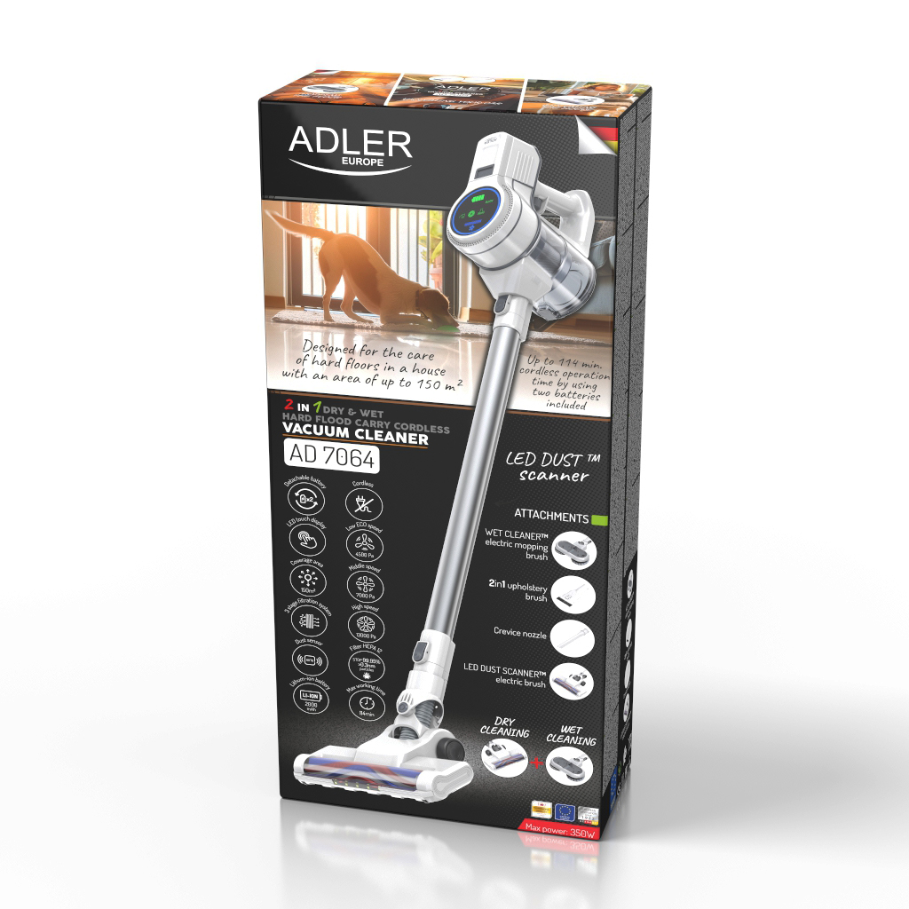 Kod Towaru: 5905575905130, Adler AD 7064 to zaawansowany odkurzacz bezprzewodowy 2w1, idealny do czyszczenia na sucho i na mokro podłóg twardych, takich jak gres, terakota, panele czy parkiet. Dzięki nowoczesnej technologii, dużej mocy i długiemu czasowi pracy, ten odkurzacz zapewnia doskonałe efekty sprzątania w domu o powierzchni do 150 m², jest to idealne narzędzie do utrzymania czystości w każdym domu.