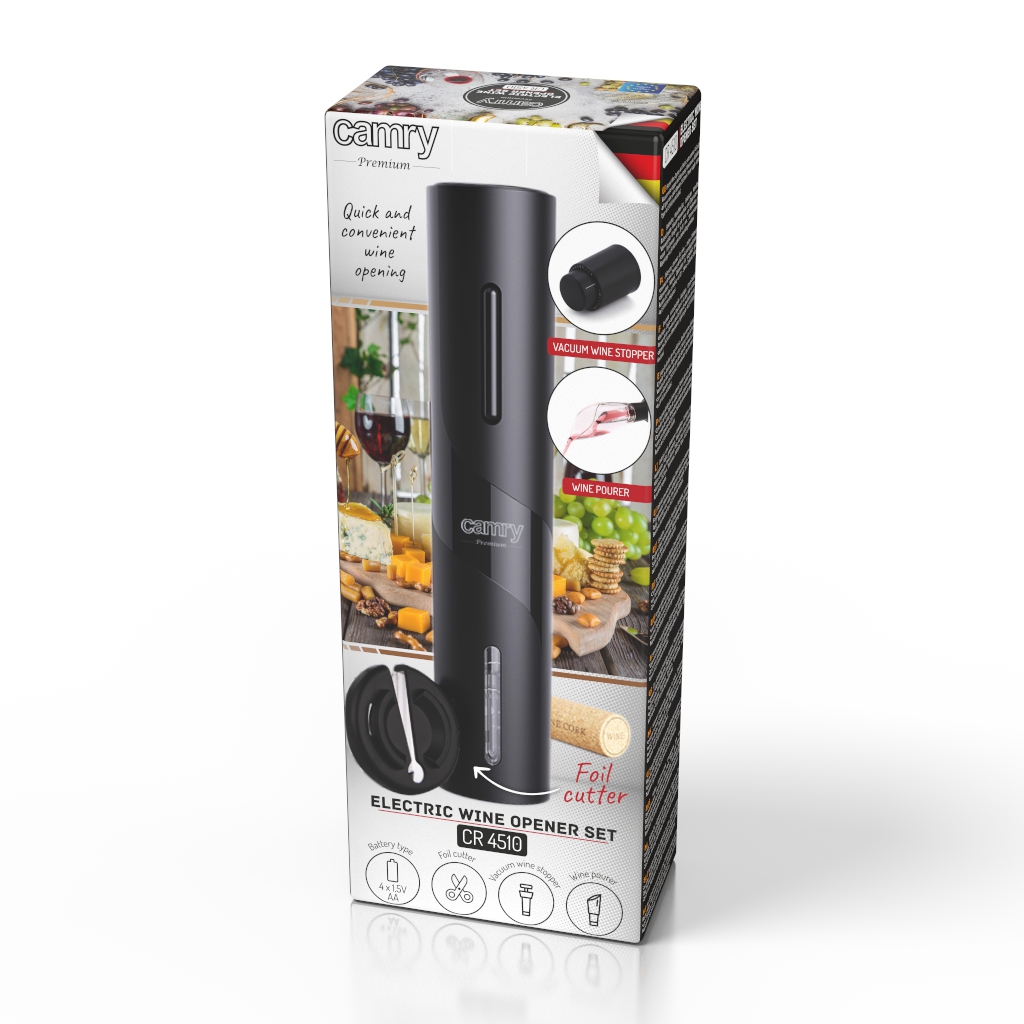 Zestaw Camry CR 4510 to doskonały prezent dla każdego miłośnika wina. Elegancki design, łatwość użytkowania i funkcjonalność sprawiają, że jest to niezastąpiony gadżet podczas każdej kolacji czy spotkania z przyjaciółmi. Ciesz się każdą chwilą z ulubionym winem dzięki elektrycznemu otwieraczowi do wina Camry CR 4510.