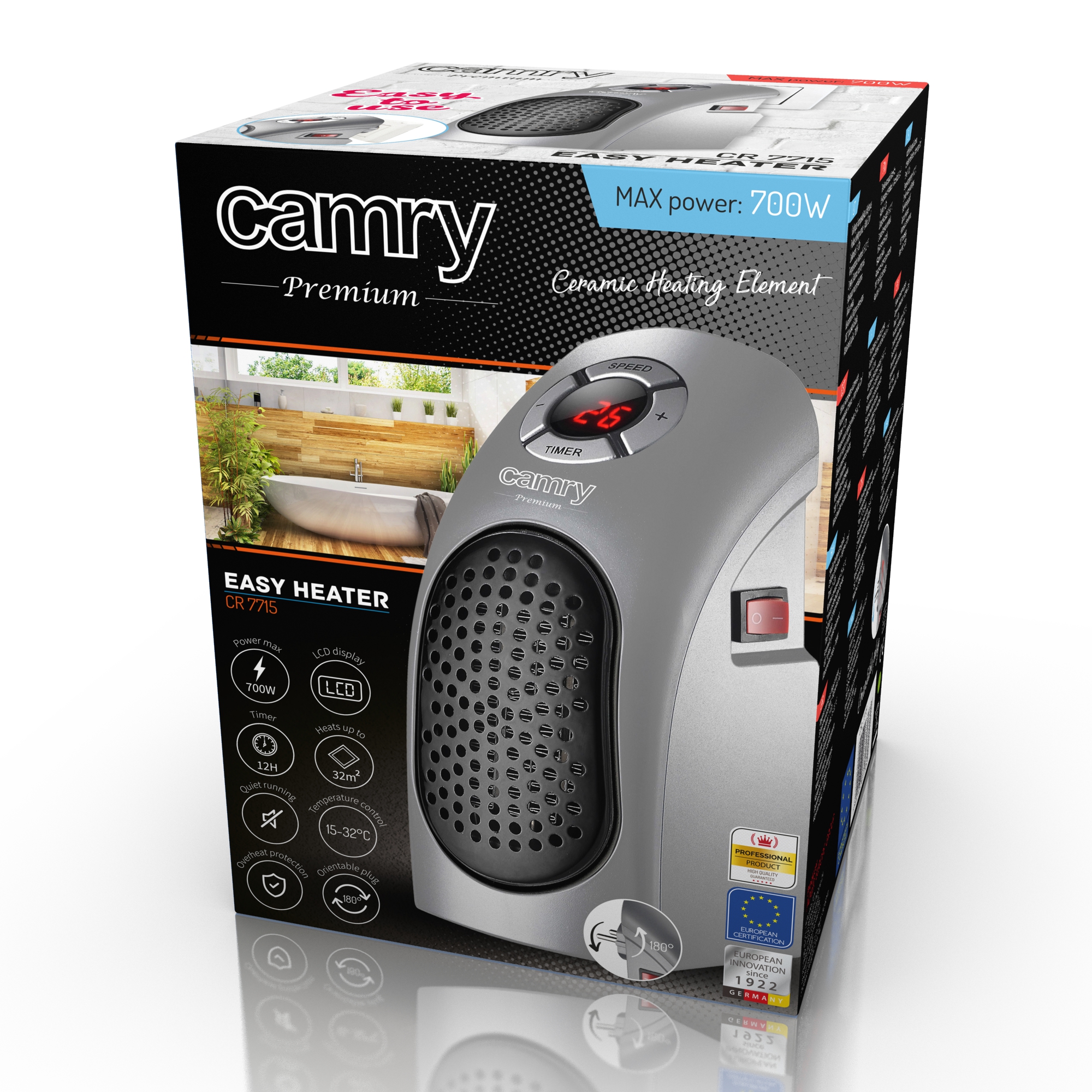 Ogrzewacz Camry CR 7715 o mocy maksymalnej 700W, mimo niewielkich rozmiarów, potrafi skutecznie nagrzać pomieszczenie o powierzchni nawet 32 m2. Dzięki kompaktowej wielkości oraz brakowi zewnętrznych kabli łatwo go przechowywać (np. w szufladzie), oraz zabrać ze sobą w podróż. Niezastąpiony w przypadku awarii ogrzewania lub konieczności dogrzania zbyt chłodnego pokoju. Programator pozwala na ustawienie długości (1-12 godzin) działania i regulację temperatury w zakresie od 15 do 32 stopni