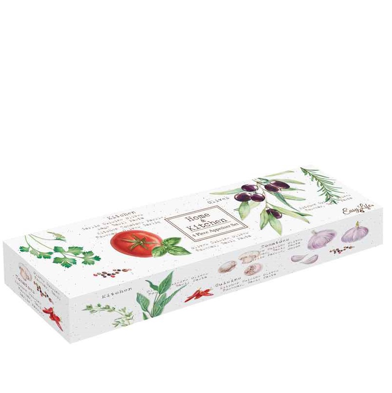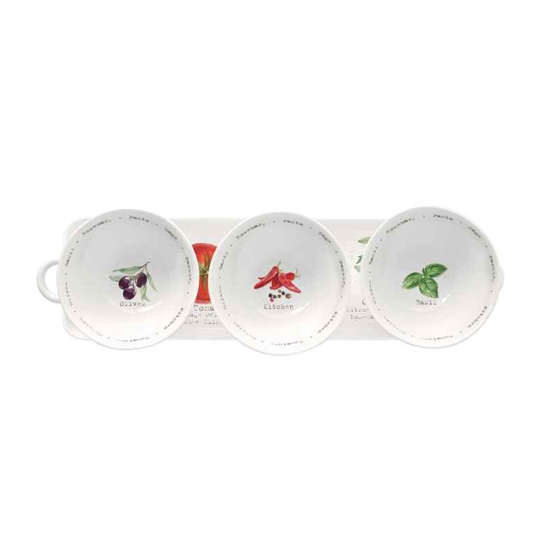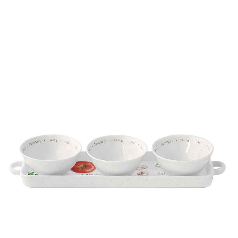 Kod Towaru: 8001544137636, 4 częściowy porcelanowy zestaw na przystawki składający się z tacy i 3 miseczek, wymiary tacy: 37×10 cm, wymiary miseczek: pojemność: 150ml, średnica
