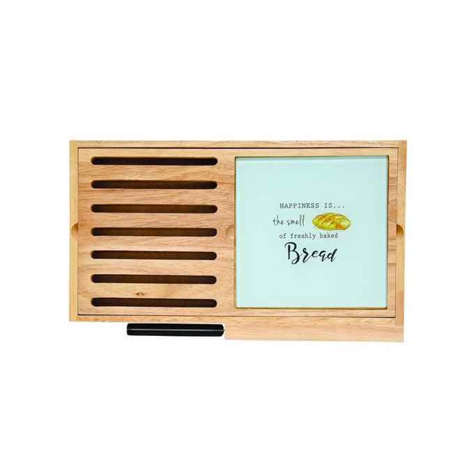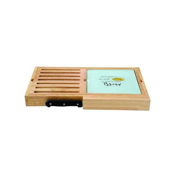 Kod Towaru: 8001544100210, Zestaw składający się z drewnianej tacy z uchwytami o wymiarach 40×24 cm, z wkomponowaną szklaną deską do krojenia i nożem do chleba ,w kolorowym opakowaniu