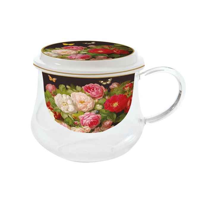 Kod Towaru: 8001544123394, Filiżanka ze szkła borokrzemowego o pojemności 275ml wraz porcelanowym zaparzaczem i pokrywką,w kolorowym opakowaniu