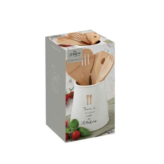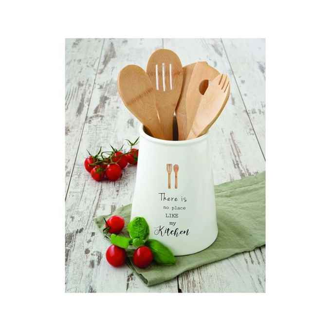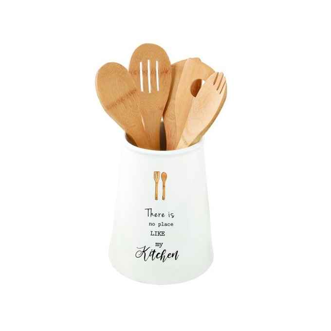 Kod Towaru: 8001544100371, Pojemnik porcelanowy na przybory kuchenne o średnicy 15 i wysokości 20 cm,w zestawie z kompletem 5 bambusowych narzędzi kuchennych
