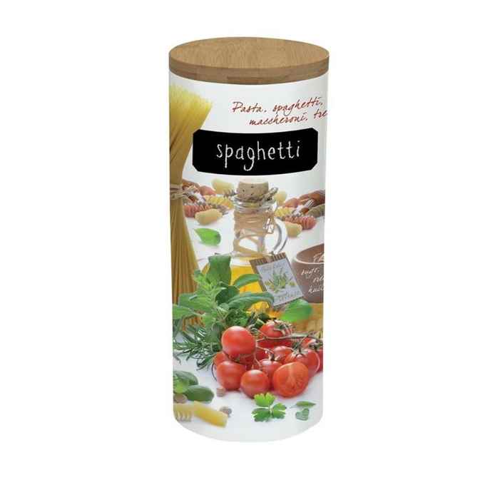 Kod Towaru: 8001544047140, Porcelanowy pojemnik z miejscem na opis o wymiarach O11x26 cm i pojemności 1750g, z bambusową przykrywką i kredą,