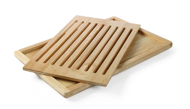 Deska do krojenia pieczywa firmy HENDI ma wbudowaną tacę na okruchy z wyjmowaną kratką, co pomaga w utrzymaniu blatu w czystości.