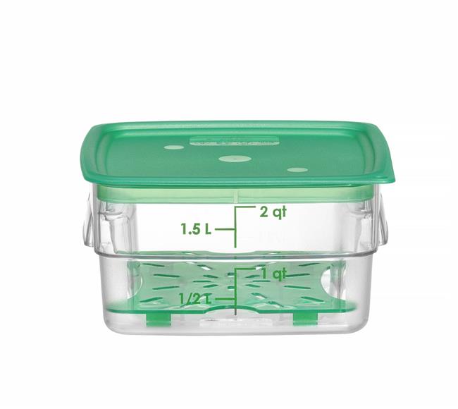 Pojemnik na żywność CamSquares® Fresh Pro firmy Cambro to wielorazowe i przyjazne środowisku rozwiązanie pozwalające na wydłużenie czasu przydatności żywności. Nadaje się do mokrych i suchych produktów. Jest idealny do przechowywania ziół i przypraw, warzyw, mięs, owoców morza czy płynów. Wykonanie z poliwęglanu, materiału odpornego na odbarwianie się, kwasy spożywcze i zapachy, sprawia, że pojemnik jest niezwykle wytrzymały i tym samym doskonale się sprawdzi w profesjonalnych kuchniach. Teksturowana powierzchnia z boku, zaokrąglone rogi i ergonomiczne uchwyty zwiększają wygodę użytkowania. Pokrywki są sprzedawane oddzielne (dostępne w HENDI).