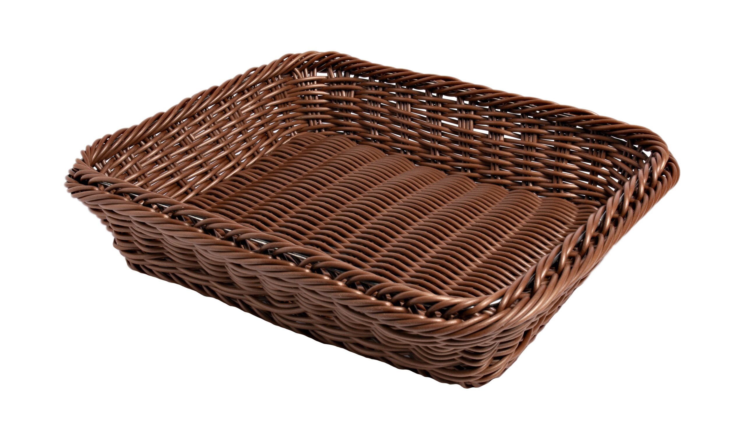 wykonany z poliratanu kolor brązowy solidne wykonanie z ramą z drutu ze stali nierdzewnej do stabilizacji koszyka odporny na wodę wykonany z twardego, elastycznego, nietłukącego materiału możliwość sztaplowania przyjazny dla środowiska nadający się do rec