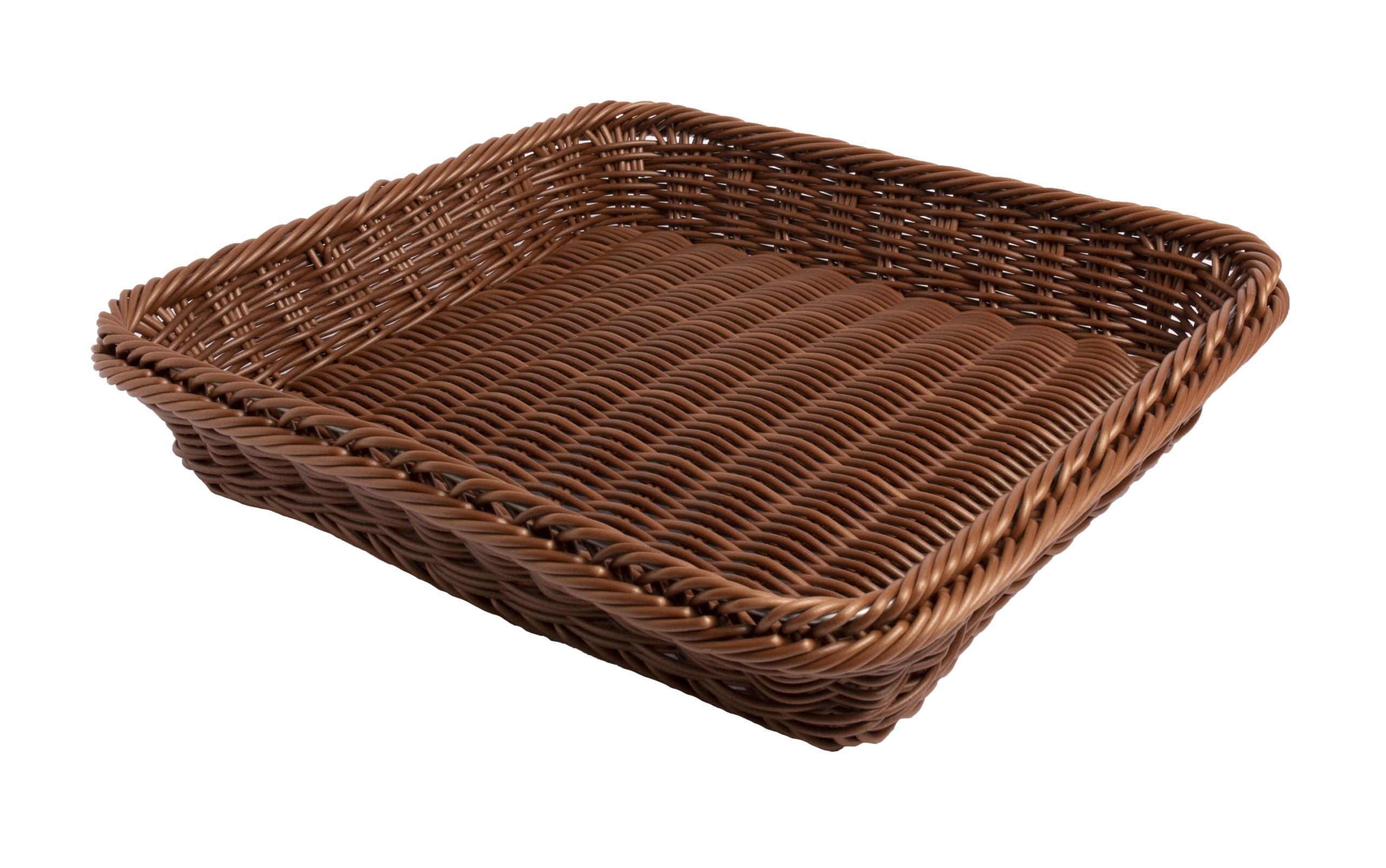 wykonany z poliratanu kolor brązowy solidne wykonanie z ramą z drutu ze stali nierdzewnej do stabilizacji koszyka odporny na wodę wykonany z twardego, elastycznego, nietłukącego materiału możliwość sztaplowania przyjazny dla środowiska nadający się do rec
