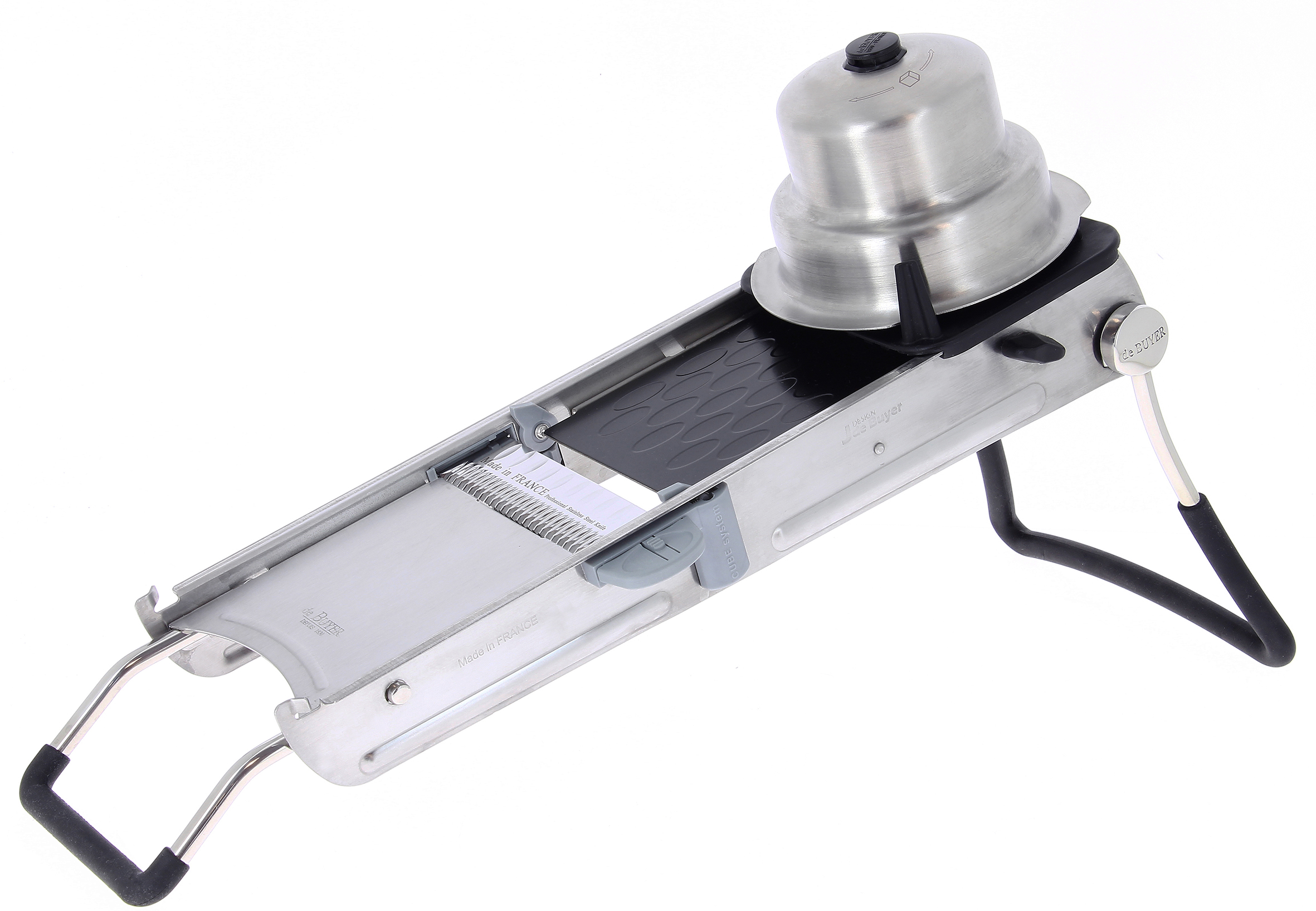 wykonane ze stali nierdzewnej i kompozytu polimerowego & nóżki antypoślizgowe ergonomiczny uchwyt system regulacji grubości cięcia opatentowany system krojenia w kostkę podwójne poziome ostrze (gładkie i faliste) 3 ostrza Julienne: 2,4,10 mm.