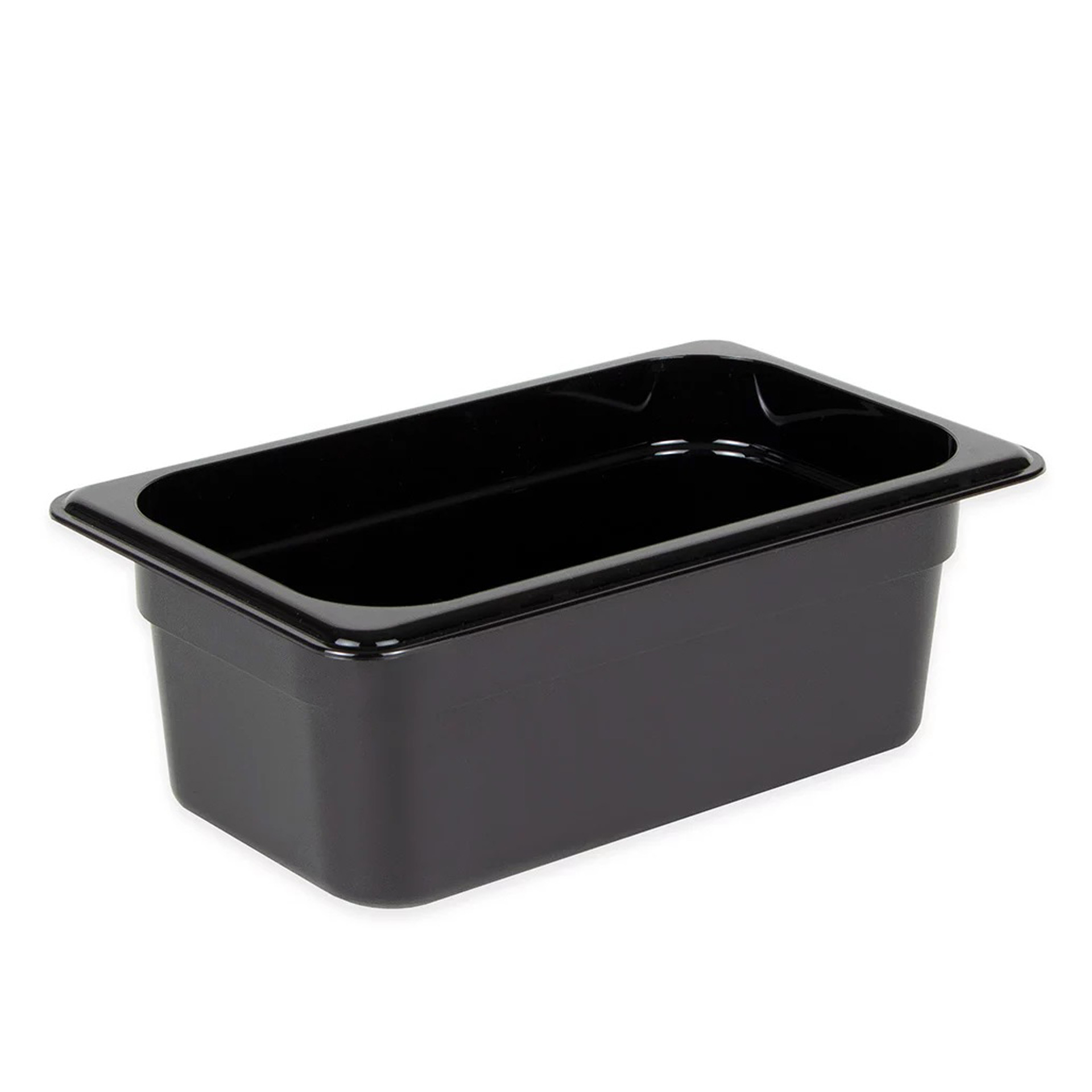 pojemnik w kolorze czarnym, wykonany z trwałego poliwęglanu do przechowywania, transportu i wydawania z jednego pojemnika nie pęka, nie wygina się i nie wgniata dno o dużym promieniu dla zmniejszenia odpadów wytrzymuje temperaturę od -40° to 99°C nie reag