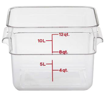 kwadratowy pojemnik na żywność wykonany z przeźroczystego, nietłukącego się poliwęglanu odporny na temperatury od -40° do 99°C miarka nadrukowana na zewnątrz odporny na plamy i zapachy szerokie wbudowane uchwyty ułatwiające przenoszenie