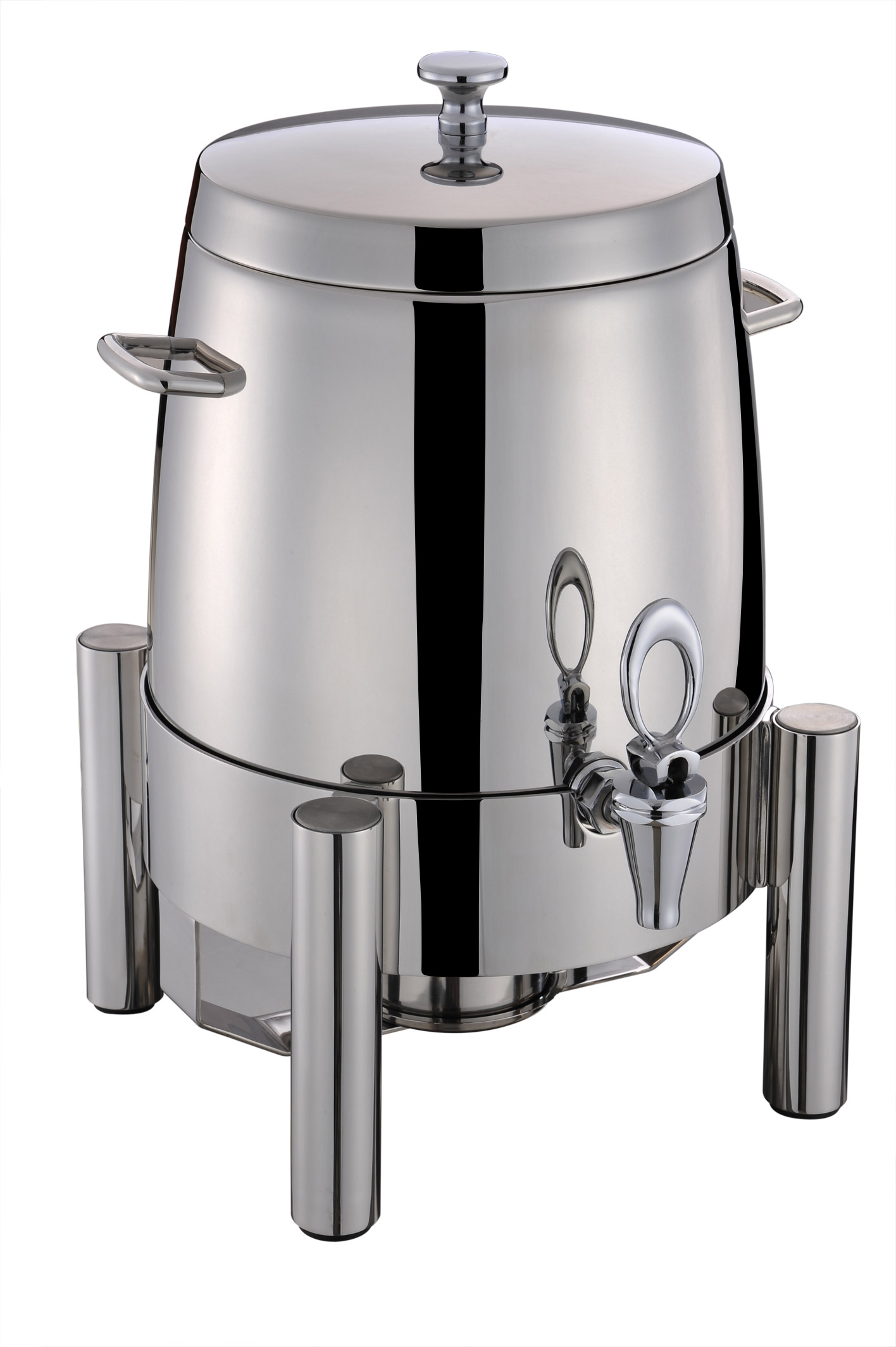 stal nierdzewna 18/10, wysokopolerowana wygodne uchwyty stabilna podstawa podgrzewana pastą lub grzałką elektryczną metalowy kranik