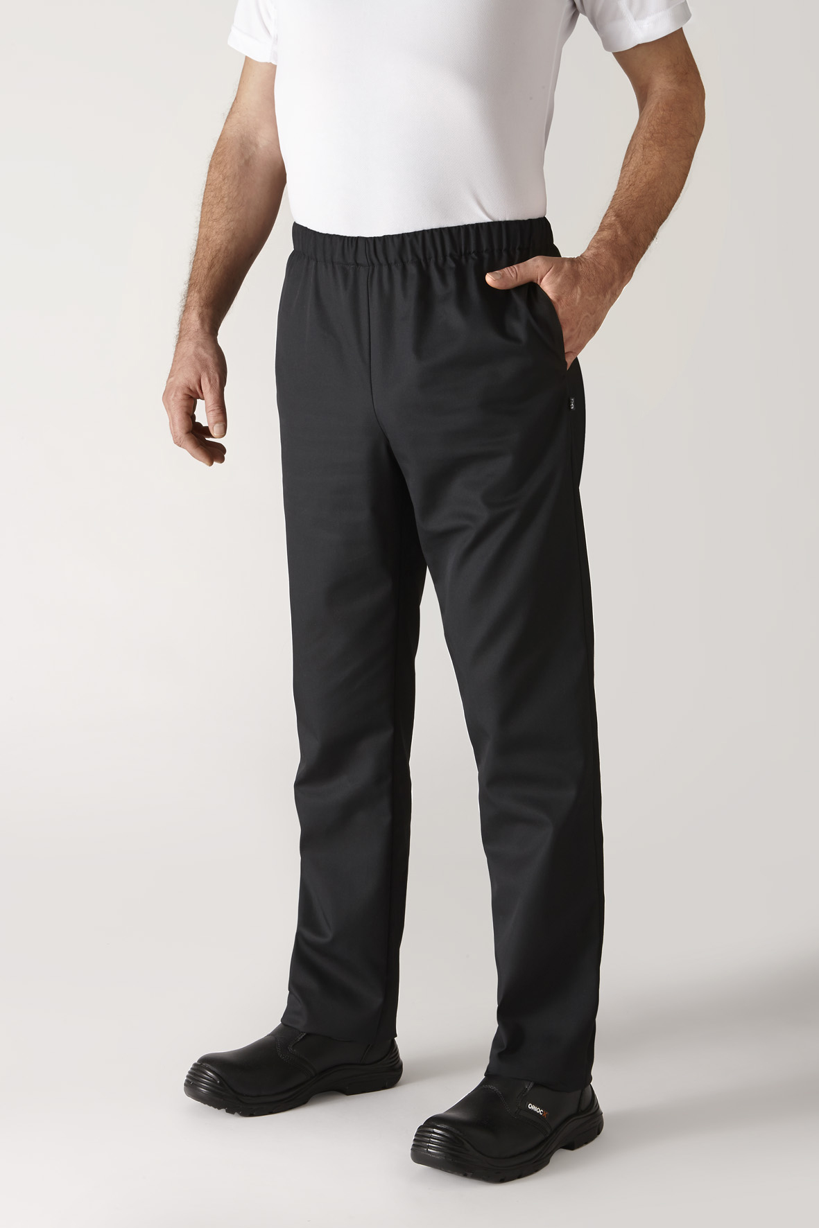 tkanina: polibawełna 195-215 g/m2 (65% poliester, 35% bawełna) praktyczna guma w pasie kieszenie boczne na szwie proste nogawki z zatrzaskami na dole do regulacji klasyczny fason