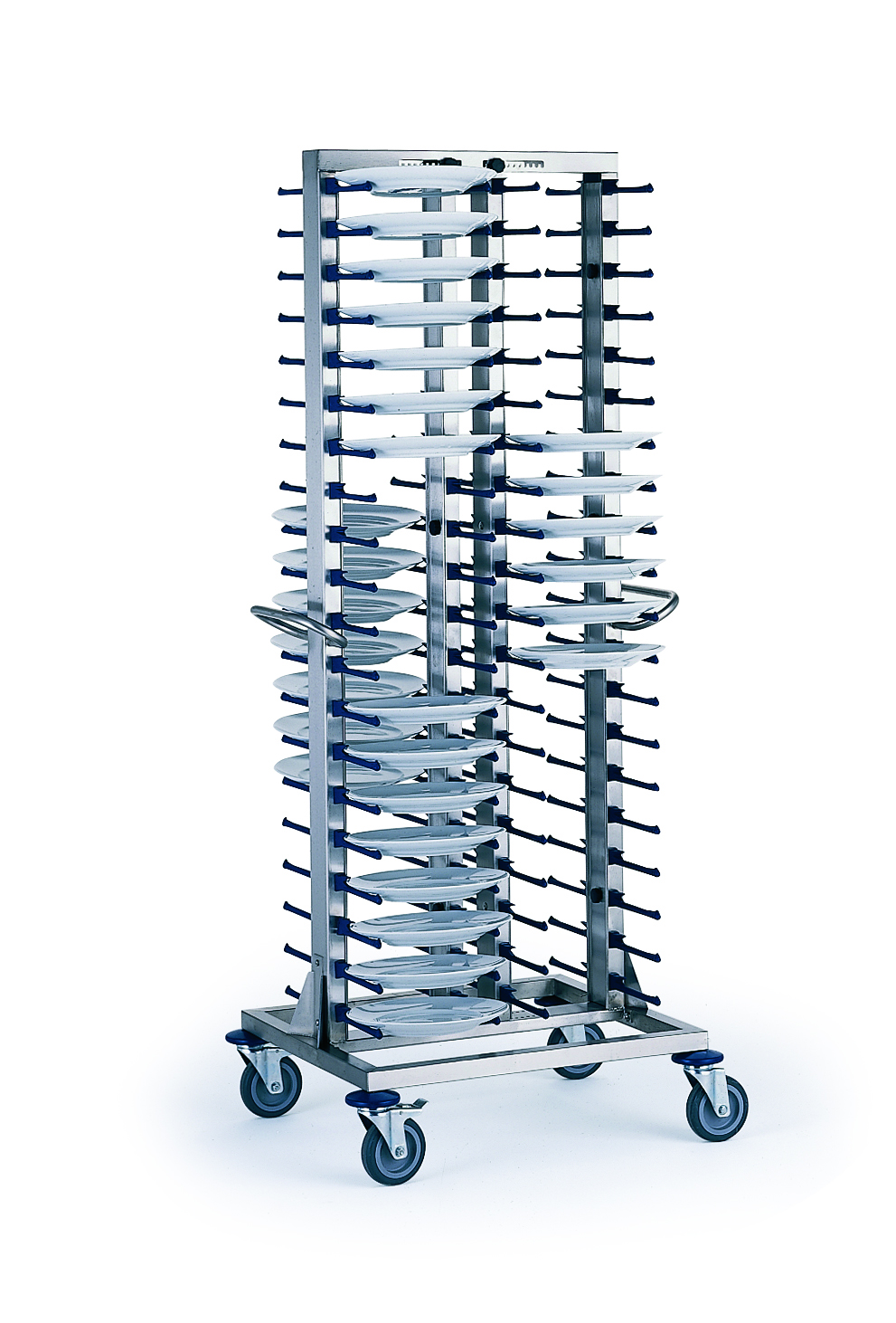stal nierdzewna i tworzywo sztuczne uchwyty wyprofilowane w kształcie ludzkich dłoni z trzema zagięciami mieści 80 szt talerzy regulacja szerokości: talerz do 30 cm 4 koła skrętne, 4 hamulce średnica kól 125 mm możliwość dokupienia pokrowca i uchwytu