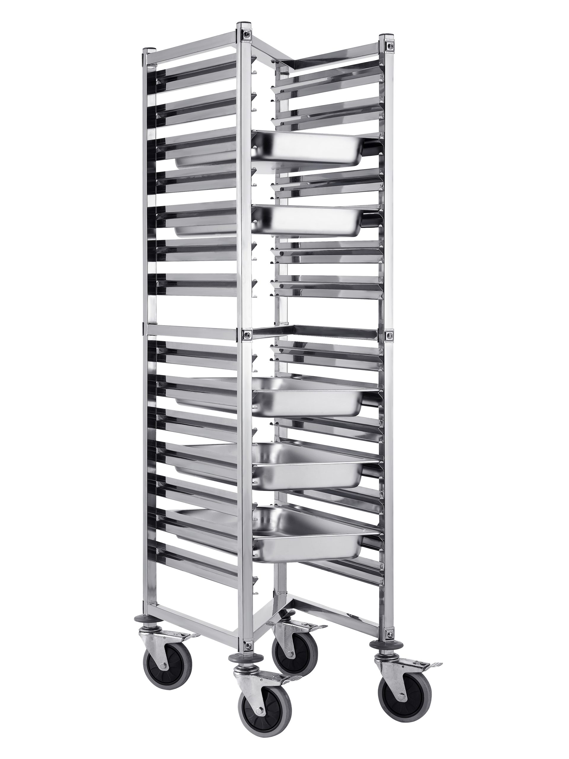 stal nierdzewna konstrukcja skręcana miesci 15 szt pojemnika GN 1/1 dzięki konstrukcji w literę Z możliwość sztaplowania – wjeżdża jeden w drugi koła skrętne i 4 hamulce